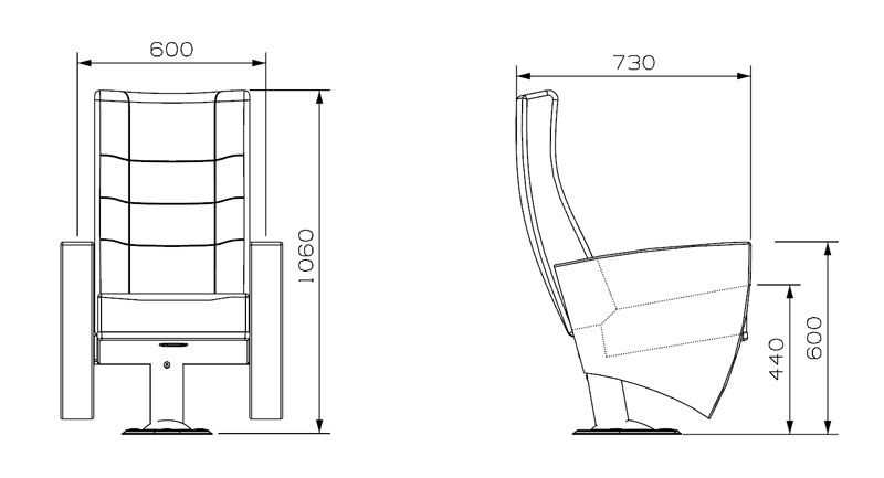The leg connection parts of the seats are manufactured from 100 mm diameter and 2.5 mm wall thickness pipe, and the floor connection parts are made of at least 2 mm thick sheet metal, molded to give strength. Armrests